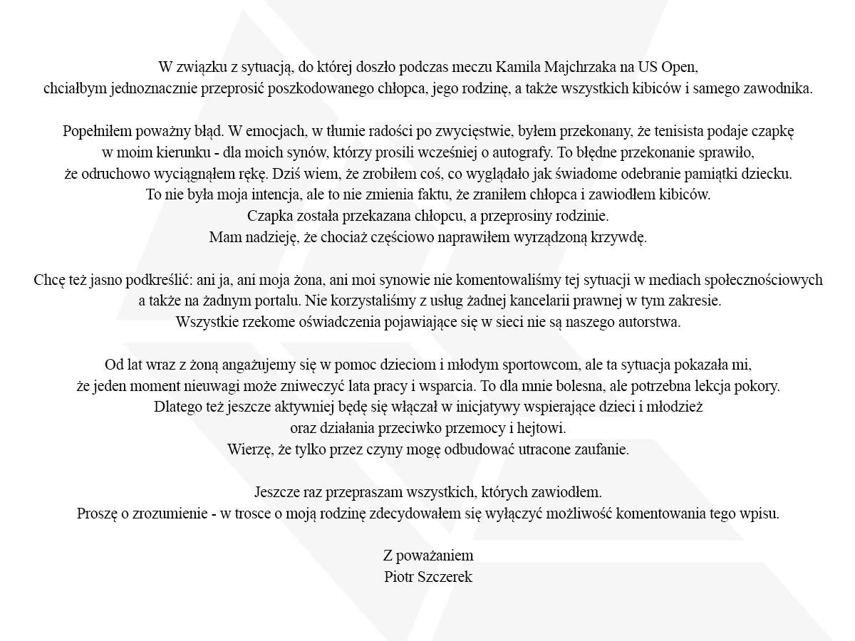 "Popełniłem poważny błąd. W emocjach, w tłumie radości po zwycięstwie, byłem przekonany, że tenisista podaje czapkę w moim kierunku – dla moich synów, którzy prosili wcześniej o autografy. To błędne przekonanie sprawiło, że odruchowo wyciągnąłem rękę. Dziś wiem, że zrobiłem coś, co wyglądało jak świadome odebranie pamiątki dziecku. To nie była moja intencja, ale to nie zmienia faktu, że zraniłem chłopca i zawiodłem kibiców. Czapka została przekazana chłopcu, a przeprosiny rodzinie. Mam nadzieję, że chociaż częściowo naprawiłem wyrządzoną krzywdę" - czytamy.